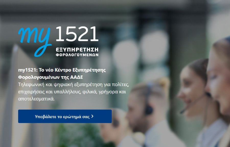 Ξεκίνησε η λειτουργία του my1521, του νέου Ολοκληρωμένου Κέντρου Εξυπηρέτησης Φορολογουμένων, που σηματοδοτεί μια πιο σύγχρονη, φιλική και αποτελεσματική εποχή εξυπηρέτησης των πολιτών από την Ανεξάρτητη Αρχή Δημοσίων Εσόδων, συνενώνοντας το τηλεφωνικό κέντρο και την ψηφιακή πλατφόρμα ερωτημάτων σε ένα ενιαίο, ολοκληρωμένο, σύστημα.