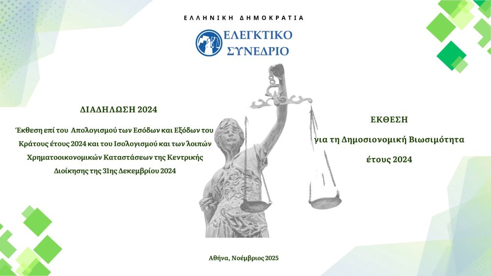 Την Τετάρτη 19 Νοεμβρίου 2025, διαβιβάσθηκε στη Βουλή των Ελλήνων, η Έκθεση του Ελεγκτικού Συνεδρίου επί του Απολογισμού των Εσόδων και Εξόδων του Κράτους έτους 2024, του Ισολογισμού και των λοιπών χρηματοοικονομικών καταστάσεων αυτού της 31.12.2024 (Διαδήλωση), καθώς και η έκθεση για τη δημοσιονομική βιωσιμότητα έτους 2024 (άρθρα 53 και 54 του Οργανικού Νόμου του Ελεγκτικού Συνεδρίου).