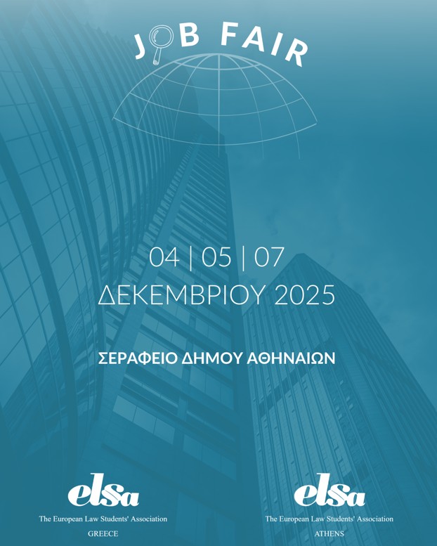 Η European Law Students’ Association (ELSA) Athens και η ELSA Greece σας προσκαλούν στο Job Fair που διοργανώνουν από κοινού την Πέμπτη 4, την Παρασκευή 5 και την Κυριακή 7 Δεκεμβρίου 2025, στο Σεράφειο του Δήμου Αθηναίων.