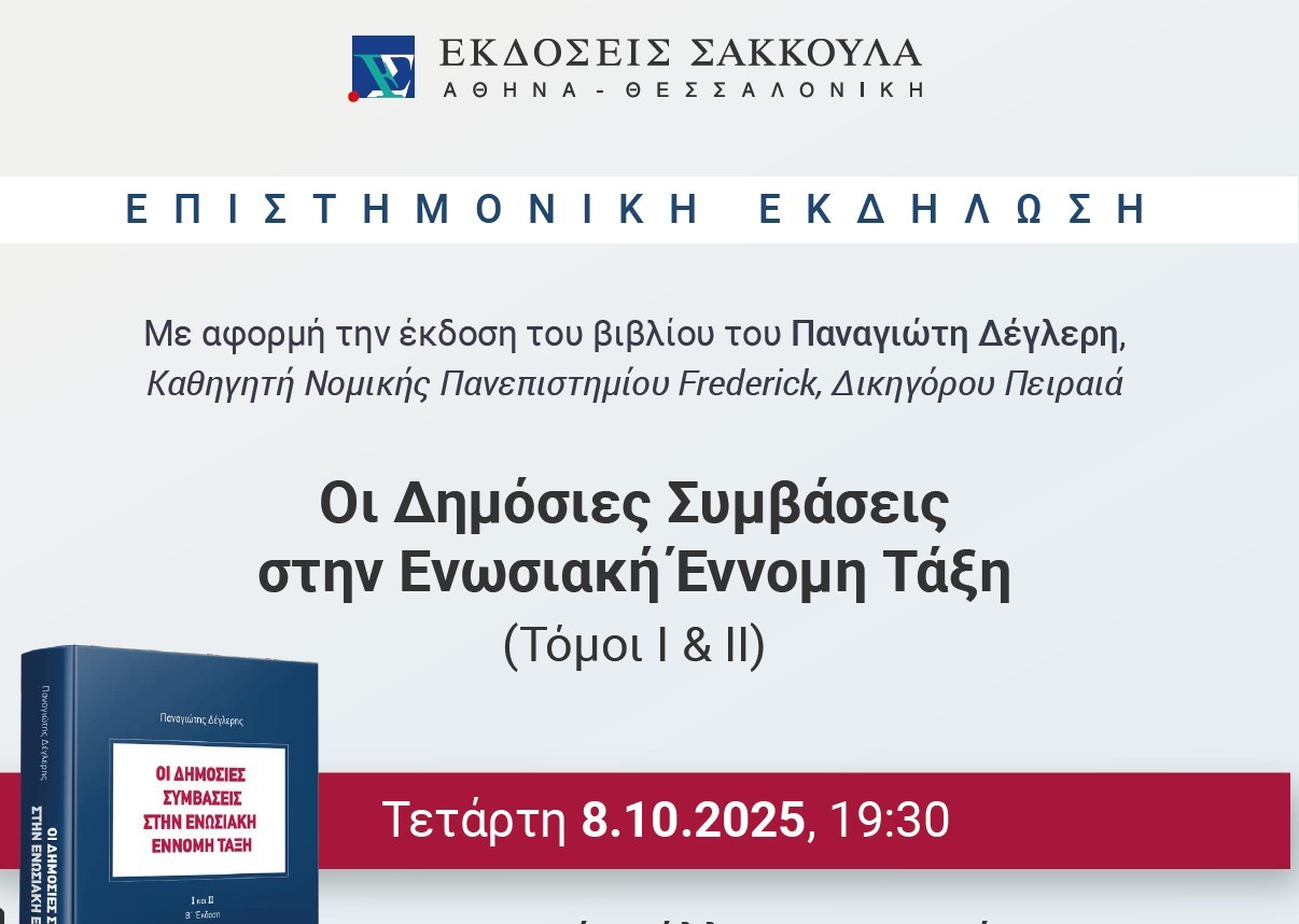 Οι Εκδόσεις Σάκκουλα, με αφορμή την έκδοση του βιβλίου του Παναγιώτη Δέγλερη, Καθηγητή Νομικής Πανεπιστημίου Frederick, Δικηγόρου Πειραιά, διοργανώνουν επιστημονική εκδήλωση με θέμα: