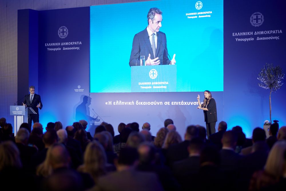 Με την παρουσία του Προέδρου της Ελληνικής Δημοκρατίας, κ. Κωνσταντίνου Τασούλα, του Πρωθυπουργού, κ. Κυριάκου Μητσοτάκη, Υπουργών, βουλευτών, της ηγεσίας των Ανωτάτων Δικαστηρίων και του νομικού κόσμου της χώρας, πραγματοποιήθηκε σήμερα το βράδυ, στο συνεδριακό Κέντρο της Εθνικής Ασφαλιστικής, η ετήσια απολογιστική εκδήλωση του Υπουργείου Δικαιοσύνης με θέμα: «Η ελληνική δικαιοσύνη σε επιτάχυνση».