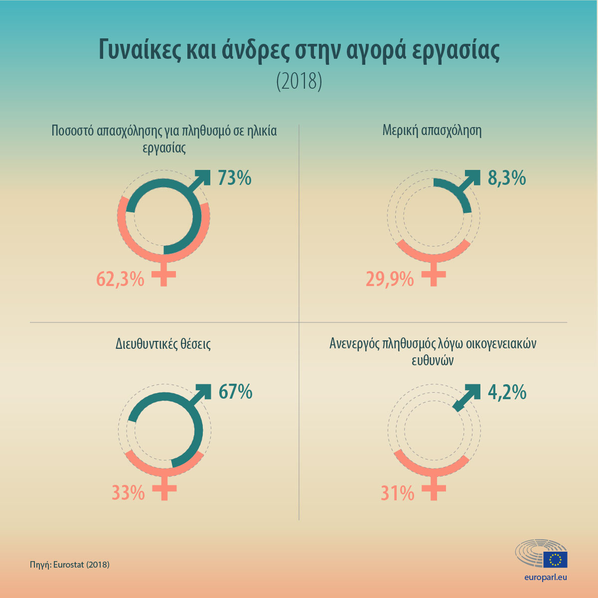 Παρότι περισσότερες γυναίκες από ό,τι άνδρες ολοκληρώνουν σπουδές ανώτατης εκπαίδευσης, λιγότερες γυναίκες αποτελούν μέρος του εργατικού δυναμικού. Σχεδόν το 30% των γυναικών στην ΕΕ εργάζεται σε θέσεις μερικής απασχόλησης ενώ είναι πολύ πιθανότερο να διακόψουν τη σταδιοδρομία τους για να φροντίσουν τα παιδιά ή συγγενείς τους.
