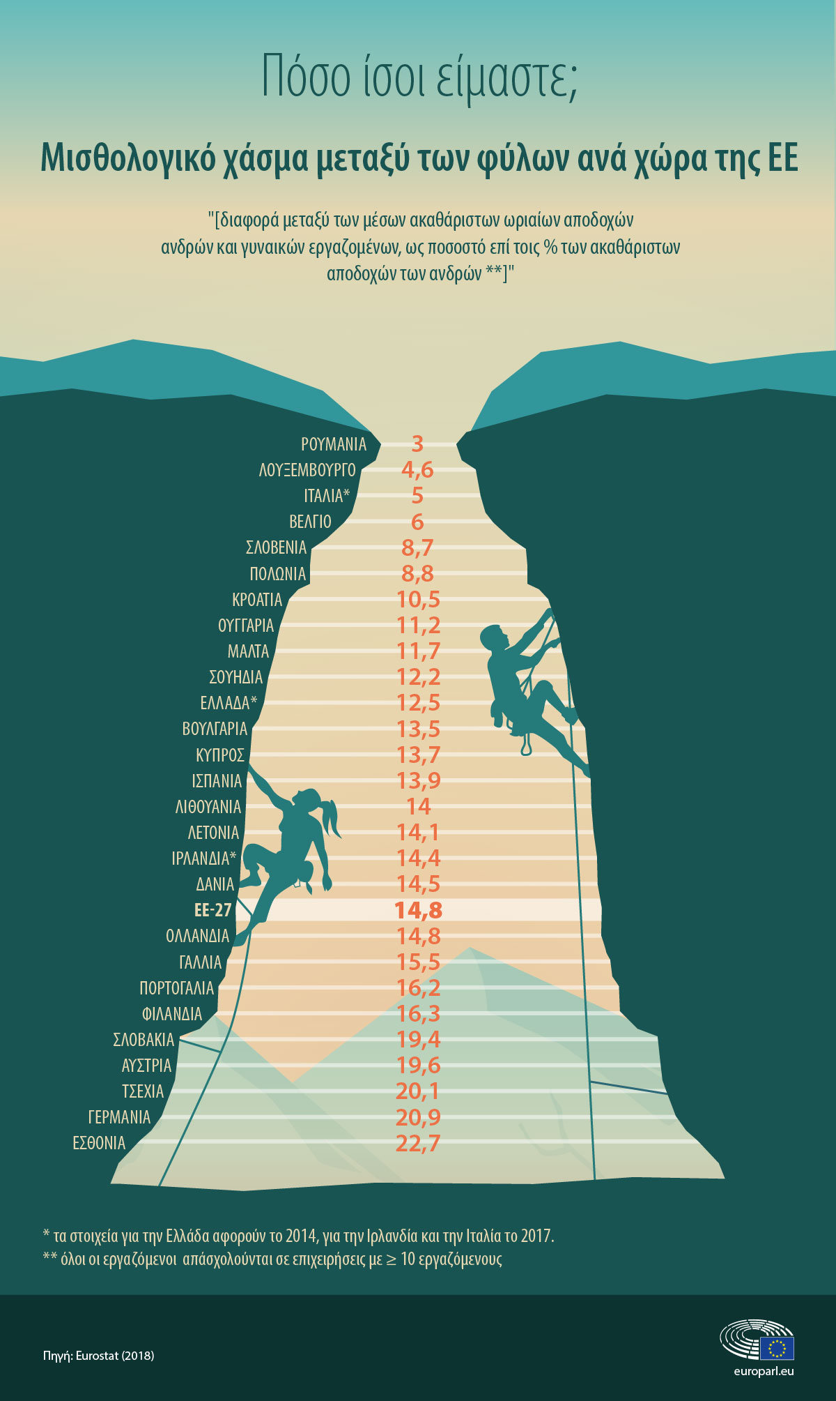 Οι γυναίκες στην ΕΕ κερδίζουν περίπου 15 % λιγότερο ανά ώρα εργασίας από τους άνδρες. Υπάρχουν, όμως, σημαντικές διαφορές μεταξύ κρατών-μελών: η μεγαλύτερη διαφορά αμοιβών σημειώθηκε στην Εσθονία (23%), ενώ το μικρότερο μισθολογικό χάσμα συναντάται στη Ρουμανία (3%). Στην Ελλάδα η διαφορά ανέρχεται στο 12,5% ενώ στην Κύπρο στο 13,7%.